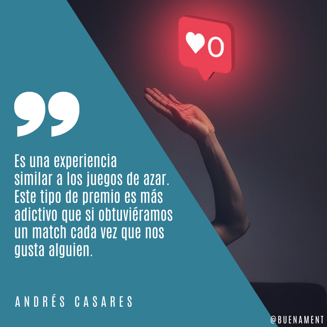 Cada vez que interactuamos con la app y damos un “me gusta” tenemos la expectativa de conseguir un “match”. Esto es un premio muy agradable, aunque normalmente sucede con un número bajo de personas en el caso de los hombres. El resultado es lo que la psicología llama “reforzamiento de razón variable“, un premio que obtenemos después de haber participado un número indeterminado de veces. Para nuestros cerebros esta es una experiencia similar a los juegos de azar, por ejemplo la ruleta. Este tipo de premio es incluso más adictivo que si obtuviéramos un match cada vez que nos gusta alguien.